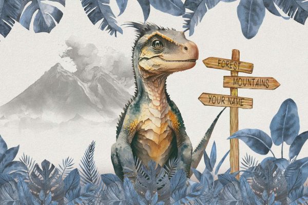 Een baby velociraptor in de blauwe jungle. Ook verkrijgbaar met naam van je kind!