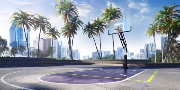 Basketbalveld in een moderne stad in verschillende materialen
