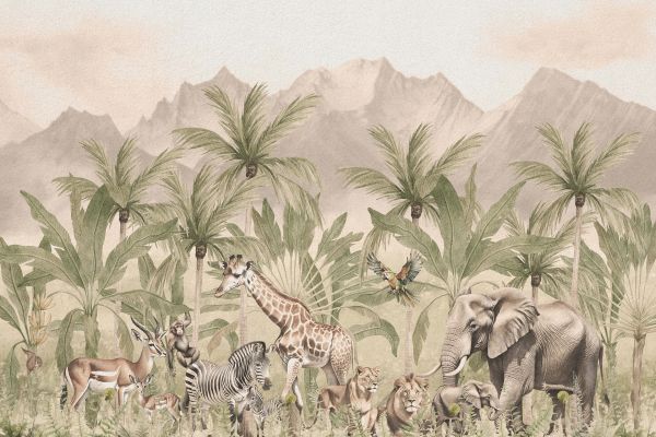 Dit adembenemende design neemt je mee op een reis door een weelderig berglandschap, waar kleurrijke flora en fauna samenkomen in harmonie. Bewonder exotische safari dieren, zoals statige giraffen, elegante leeuwen en nieuwsgierige olifanten, die zich vrij bewegen in hun natuurlijke habitat. Laat je inspireren door de natuurlijke pracht van een safari, rechtstreeks in jouw eigen leefruimte.