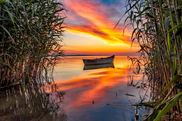 Boot met riet in de avond fotobehang