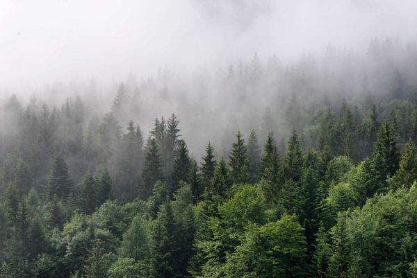 Bovenaanzicht van een mistig bos in verschillende materialen