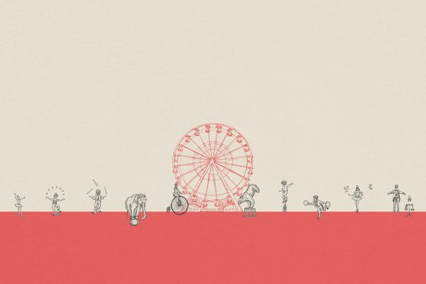 Een mooie illustratie van circus mensen en dieren op een beige achtergrond.