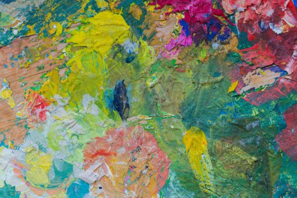 Close-up van een kleurrijk schilderwerk in verschillende materialen
