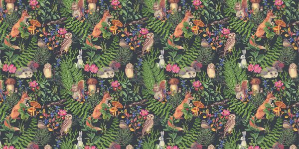 Een patroon met allemaal verschillende dieren in een bos op een donkere achtergrond.