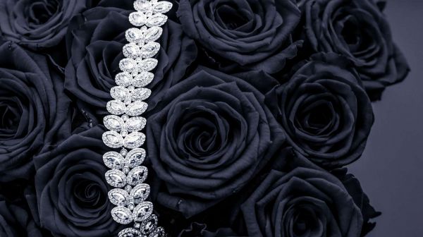 Donkere rozen met een diamanten ketting erop in verschillende materialen