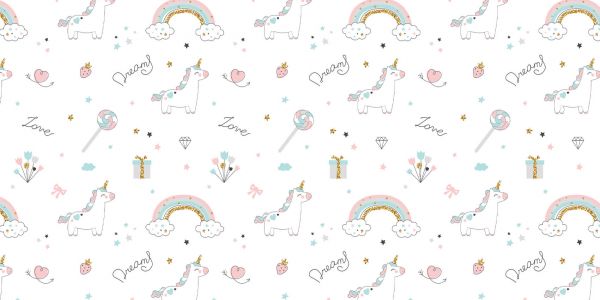 Eenhoorns, regenbogen en glitters in verschillende materialen