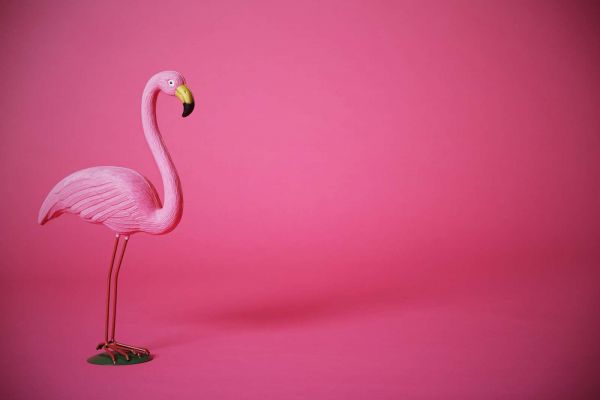 Flamingo van kunstof met een roze achtergrond in verschillende materialen