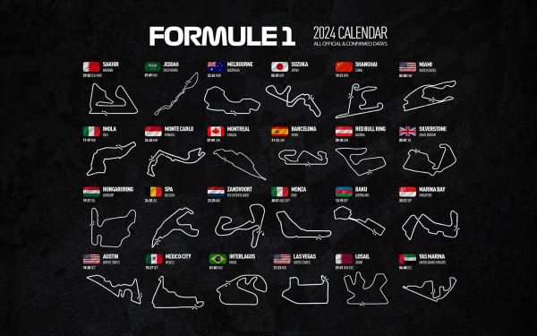 Formule 1 2024 - Data map. Op dit fotobehang staan alle races die in 2024 zijn gepland.