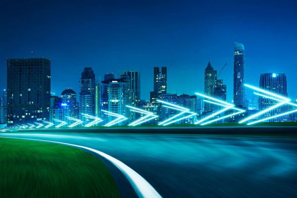 Futuristische snelweg langs een grote stad in verschillende materialen