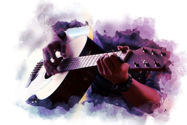 Gitaarspeler waterverf schilderij in verschillende materialen