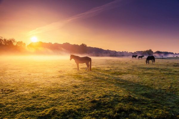 Grazende paarden bij zonsondergang