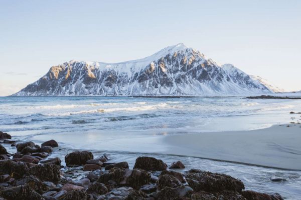 Grote ingesneeuwde rots in Noorwegen fotobehang