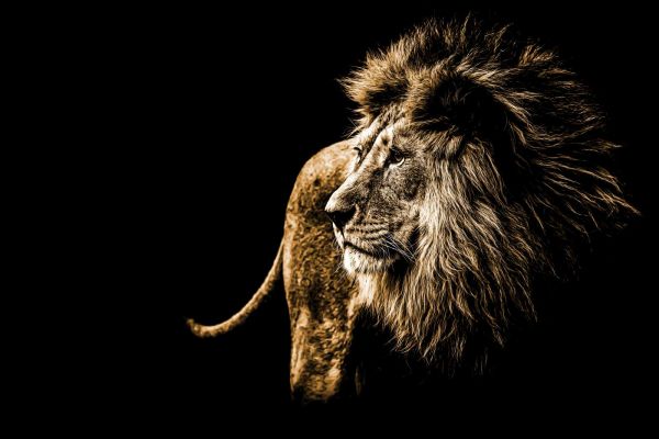 Harige leeuw met een zwarte achtergrond in verschillende materialen