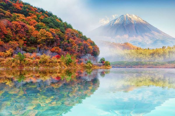 Helder blauw meer met een vulkaan op de achtergrond fotobehang