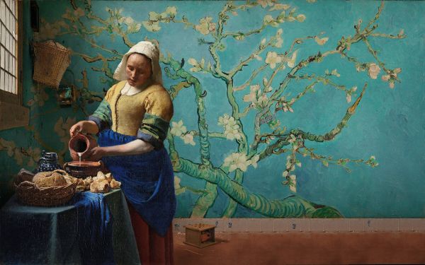 Het Melkmeisje met de amandelbloesem achtergrond is prachtig! Het is nog beter uitgevallen dan wat ik in gedachte had. De aansluitende muur geef ik nog een likje verf zodat het beter aansluit bij de kleuren in het behang maar ik ben er nu al super blij mij!