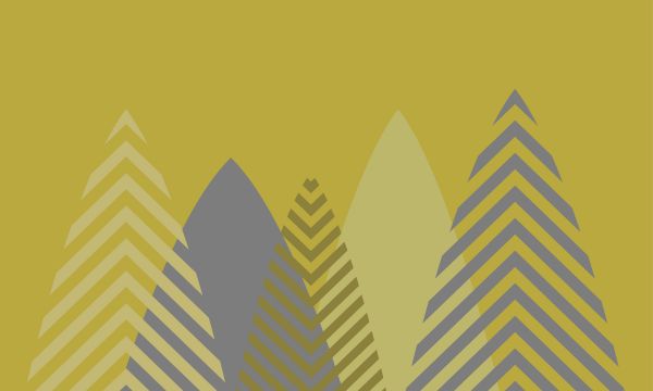 Donkergele achtergrond met een mix van gestreepte en ingekleurde bergen in verschillende grijs- en geel tinten.