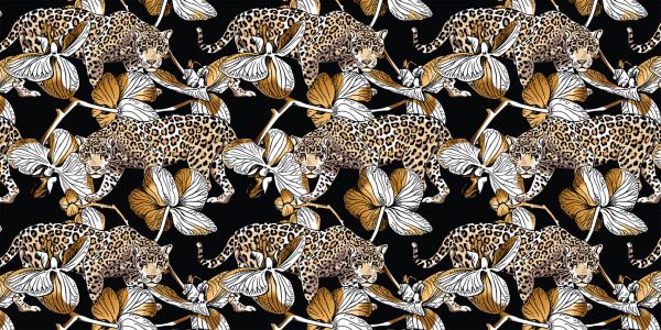 Patroon van gouden jaguars en orchideeën op een zwarte achtergrond.