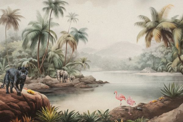Dit prachtige behangontwerp met verschillende kleuren brengt de schoonheid van de jungle naar je kamer. Het ontwerp toont een levendige scène, waarin majestueuze olifanten rustig door het landschap wandelen en de elegante zwarte panther zijn glanzende vacht laat zien. Met de prachtig gekleurde jungle bomen en planten, is het de perfecte keuze voor liefhebbers van de natuur!