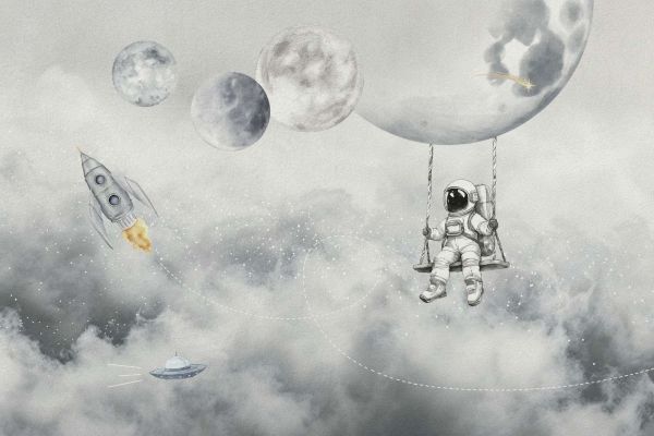 Deze illustratie toont een levendige scène met ruimtevaartuigen die sierlijke banen trekken rond gedetailleerd getekende planeten, allemaal badend in een zacht, nevelig licht. Het is een speelse mix van fantasie en realisme, vastgelegd in een gedempt kleurenpalet.