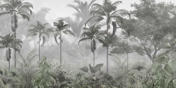 Een levendige tapestry van het oerwoud, gedetailleerd met verschillende tinten groen die de rijke variëteit van tropische flora tentoonspreiden. De diversiteit in bladvormen en de gelaagdheid van de beplanting brengen het ontwerp tot leven.