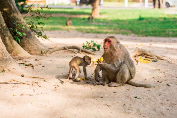Moeder aap geeft haar kindje te eten fotobehang