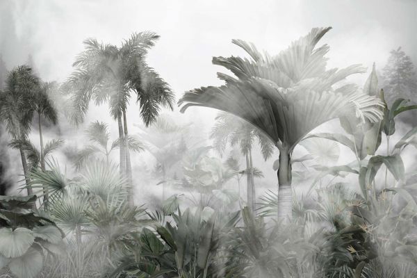 Een zachte, monochrome compositie van tropische bladeren en palmen, omhuld door mist. Deze afbeelding speelt met texturen en tinten van wit en grijs, wat zorgt voor een rustgevend en koel gevoel van een nevelige ochtend in een weelderige jungle.