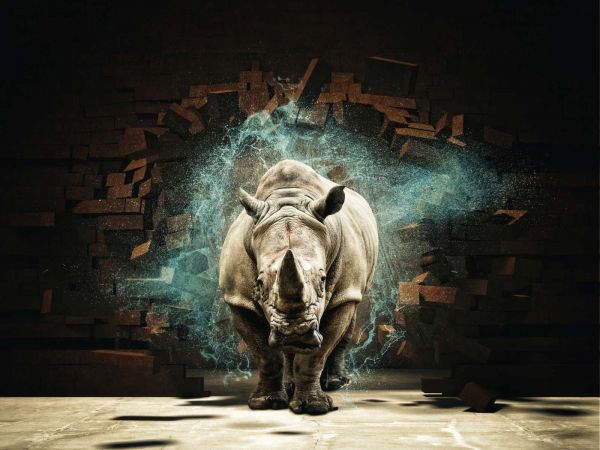 Neushoorn breekt door de muur