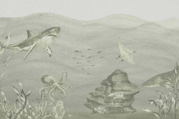 Een prachtige afbeelding met zwemmende haaien, een rog en een octopus in groen.