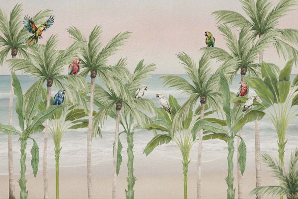 Breng de tropische sfeer naar je interieur met ons prachtige behang met palmbomen en papegaaien op het strand. Dit luxueuze behang brengt de rustgevende vibes van een exotisch paradijs rechtstreeks naar jouw muren. De gedetailleerde afbeeldingen van wuivende palmbomen en kleurrijke papegaaien creëren een levendig en levendig gevoel, waardoor je je elke dag kunt onderdompelen in een ontspannen vakantiegevoel.