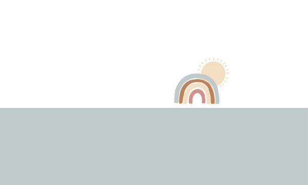 Grijs-blauwe achtergrond met een kleine pastelkleurige regenboog en zon aan de rechterkant.
