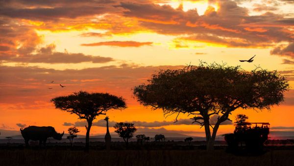 Safari in Afrika bij zonsondergang in verschillende materialen