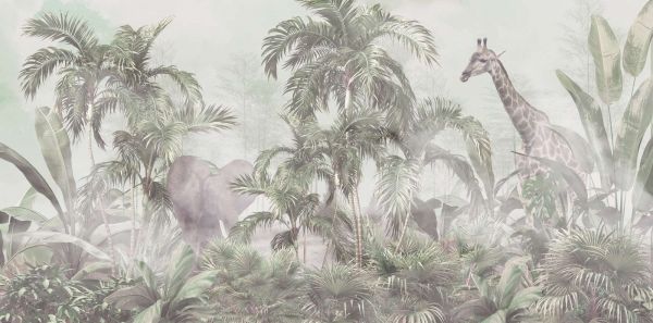 In deze betoverende scène worden de gracieuze silhouetten van een giraffe en een olifant omlijst door het weelderige groen van een nevelig tropisch bos. De subtiele kleurpaletten versterken het gevoel van een vredige dageraad op de savanne.