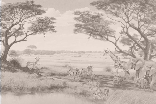 Een schilderachtige impressie van de Afrikaanse savanne, waar het zachte kleurenpalet van bruin- en beigetinten de kalmte van de natuur uitademt. De harmonieuze samenkomst van olifanten, giraffen en zebra's weerspiegelt een vredige co-existentie, terwijl de uitgestrekte horizon de weidsheid van het landschap benadrukt.
