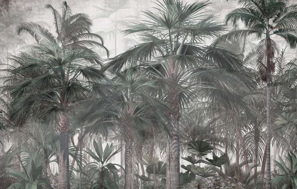 Deze afbeelding presenteert palmbomen in een dromerig landschap, waar de mist het licht filtert en een serene, bijna etherische sfeer creëert. De gelaagdheid van de vegetatie geeft diepte, terwijl de beperkte kleuren een gevoel van rustige eenvoud uitstralen.