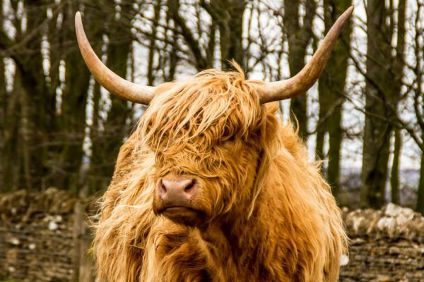 Schotse Hooglander met Bomen op achtergrond fotobehang