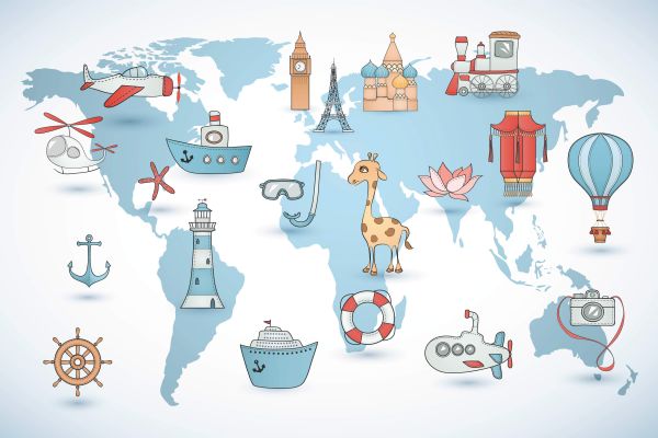 Een illustratie van een simpele wereldkaart met verschillende tekeningen erop.