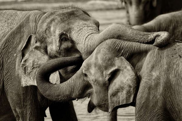 Spelende olifanten in Sri Lanka in verschillende materialen