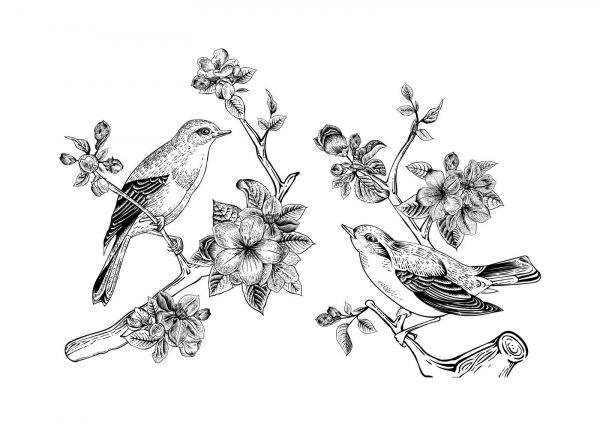 Tekening van vogels op een tak met appelbloesems fotobehang