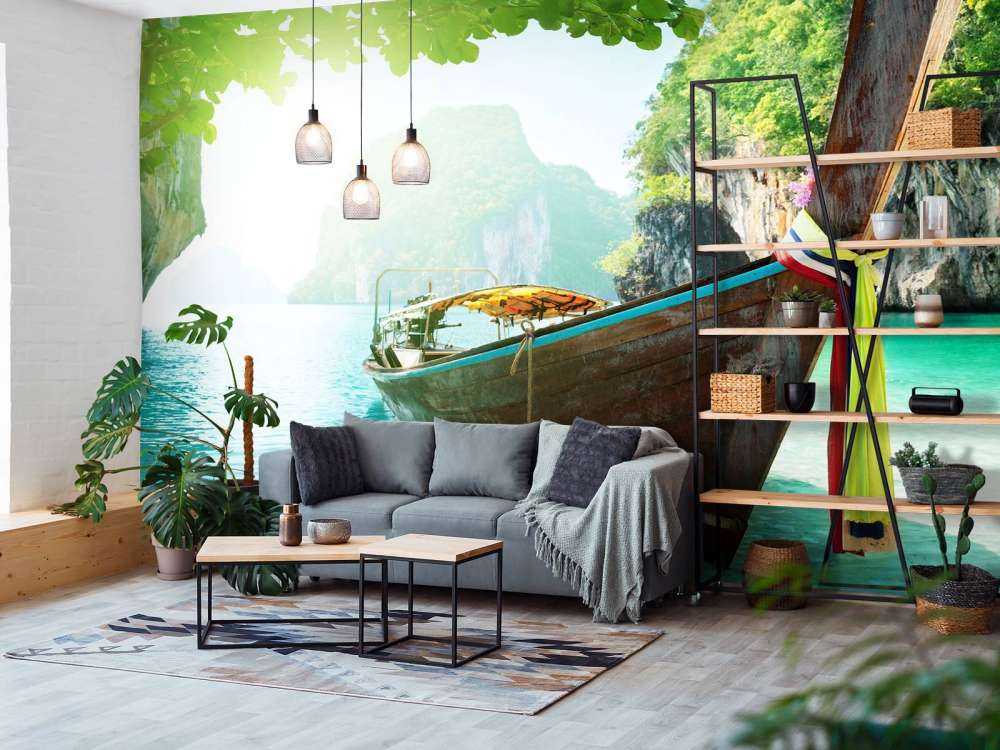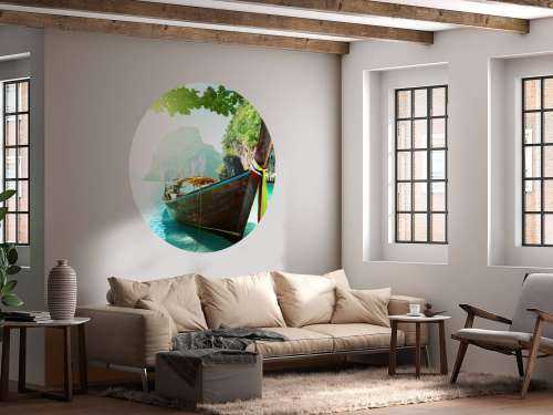 Thaise boot met eilanden op de achtergrond in verschillende materialen