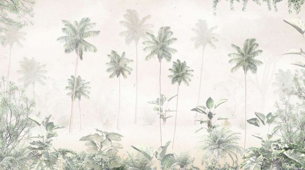 Een delicaat palet van pastelgroene en witte tinten geeft deze afbeelding van een tropisch landschap een dromerige uitstraling. De lichte nevel die tussen de palmbomen hangt, versterkt de serene en ongerepte sfeer van dit vreedzame toevluchtsoord.