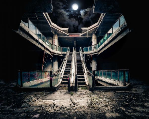 Verlaten gebouw met roltrappen bij volle maan in verschillende materialen