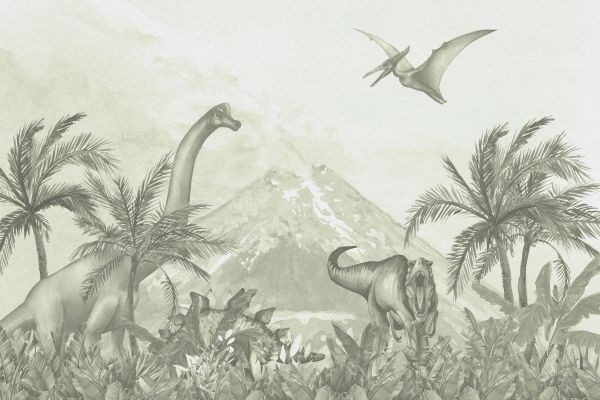 Een stoere afbeelding met verschillende dinosaurussen en een vulkaan op de achtergrond in de kleur groen.