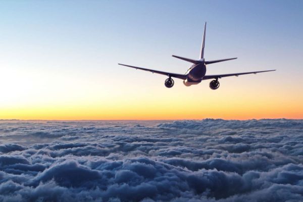Vliegtuig in de avond boven de wolken