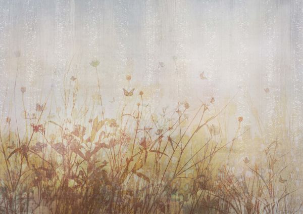 Vlinders en bloemen op fotobehang. Door de kleuren heeft dit behang een vintage uitstraling.