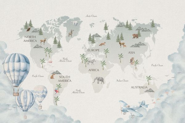 Vlieg weg naar nieuwe avonturen met onze wereldkaart in lucht thema. Dit ontwerp toont verschillende luchtvaartuigen en geeft je kamer een avontuurlijke uitstraling.