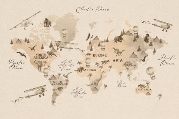 Onze wereldkaart met dino's in beige is perfect voor degenen die van geschiedenis en wetenschap houden. Het ontwerp toont verschillende soorten dinosauriërs en geeft je kamer een avontuurlijke en educatieve uitstraling.