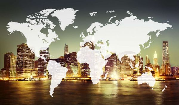 Wereldkaart met een stad op de achtergrond