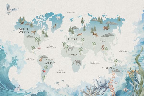 Breng de oceaan naar je kamer met onze wereldkaart met golven en dieren. Dit ontwerp is perfect voor degenen die van de zee en het strand houden. Het design toont de golven van de oceaan en bevat ook afbeeldingen van zeedieren. Perfect voor een kamer met een ontspannen sfeer.
