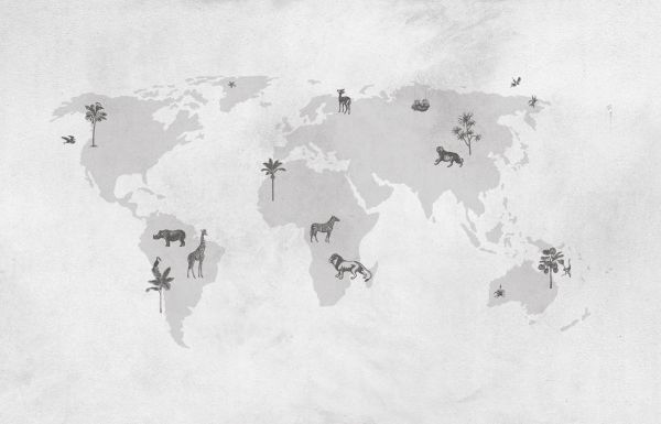 Wereldkaart sketch in het grijs. Draait de wereld alleen maar om dieren? Op dit fotobehang wel. maak jouw kinderkamer compleet!