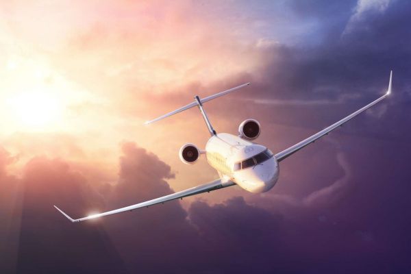 Witte vliegtuig bij zonsondergang in verschillende materialen